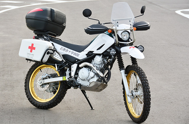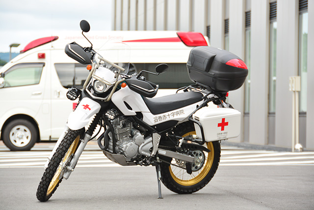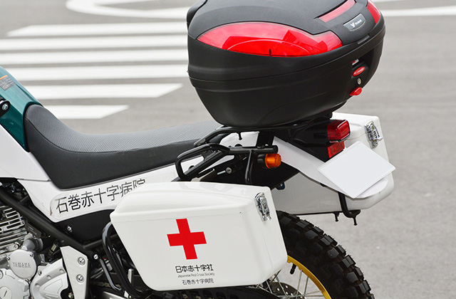 東日本大震災での教訓をふまえて、迅速な情報収集と本部への伝達、そして戦略的かつ安全な救護活動のため、2016年3月に「バイク救護隊」を結成し、マウンテントレール「セロー250」ベースの災害救援活動二輪車(以下、救援セロー)を導入された石巻赤十字病院様に活動の様子をうかがいました。