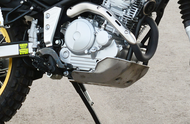 不整地走行時の飛び石などからエンジンへのダメージを軽減するアルミ製アンダーガードも
