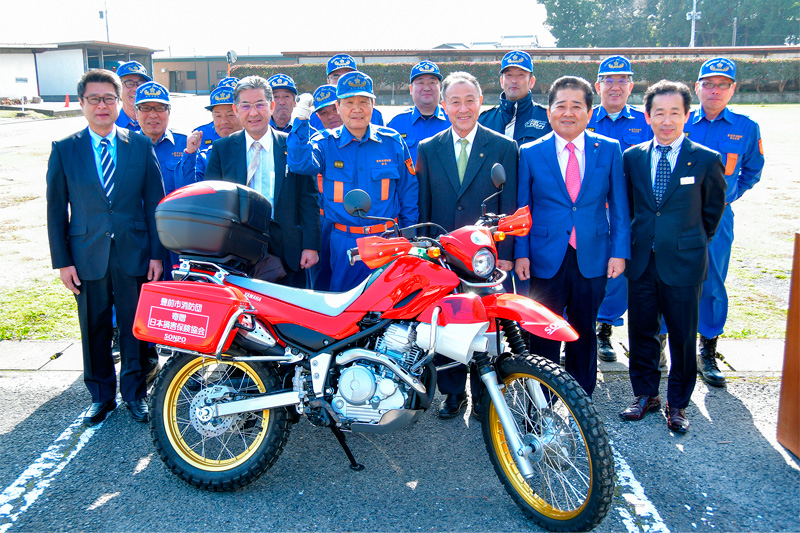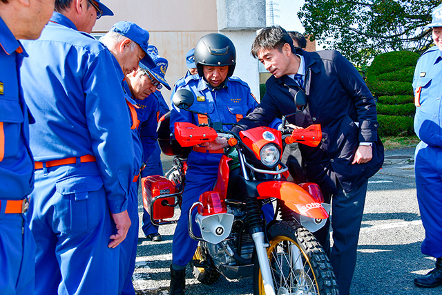 「これまで軽消防自動車や小型動力ポンプなどを寄贈してきましたが、東日本大震災や熊本地震など、自然災害時における二輪車の高い機動力を活かした初期活動の有用性を拝見し、日本損害保険協会として初めて『消防活動二輪車』を寄贈することにしました。