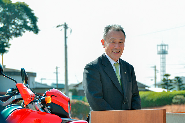 「豊前市は、美しい海と山に囲まれています。近年は自然災害が多く、豊前市消防団が災害救援や被災者の捜索などで活躍してくれています。今回『消防活動二輪車』を寄贈いただいたことで市民の生命・財産を守るために活かしていきたいと思います」