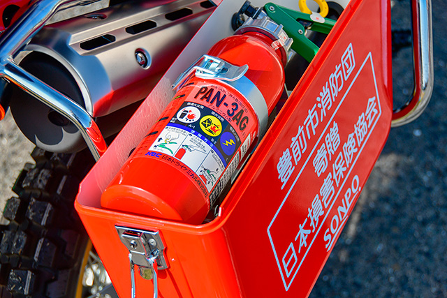 サイドバッグには消火器(3型)とバックアップ電源装置が収められている